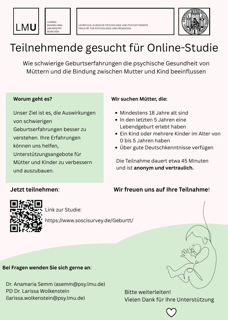 Wenn Sie in den letzten 5 Jahren eine Lebendgeburt hatten, unabhängig davon, ob Sie diese als belastend oder nicht belastend erlebt haben, würde ich mich sehr freuen, wenn Sie an einer anonymen Online-Befragung teilnehmen. Die Teilnahme kann bequem am Smartphone oder Computer durchgeführt werden und dauert ca. 45 Minuten.